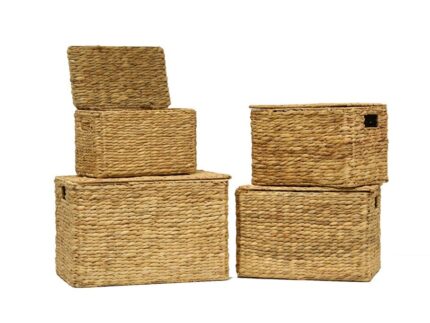 Baúl hecho con enea trenzada en tono claro. Este baúl es idóneo para la decoración de hogares de estilo rústico, además de servir para almacenar distintos utensilios. El mediano