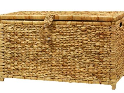 Baúl hecho con enea trenzada en tono claro. Este baúl es idóneo para la decoración de hogares de estilo rústico, además de servir para almacenar distintos utensilios.