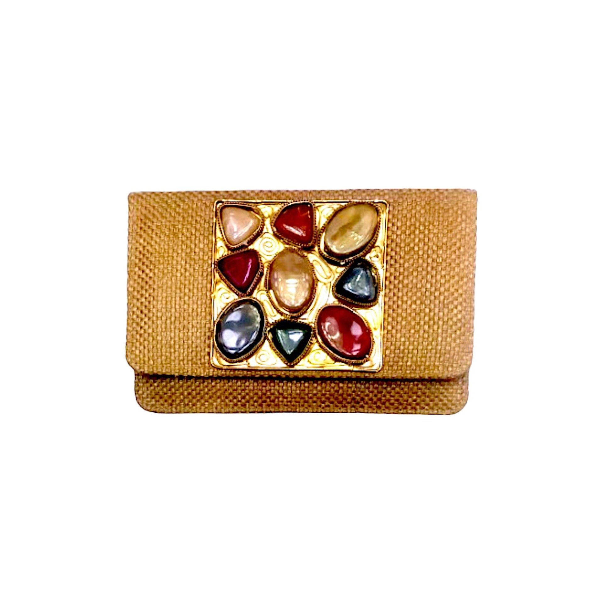 BOLSO CON PEDRERIA, MATERIAL YUTE Y SEDA, MEDIDAS: 19 X 13 X 5 CM, COLOR: ARENA, CON CADENA PARA COLGAR.