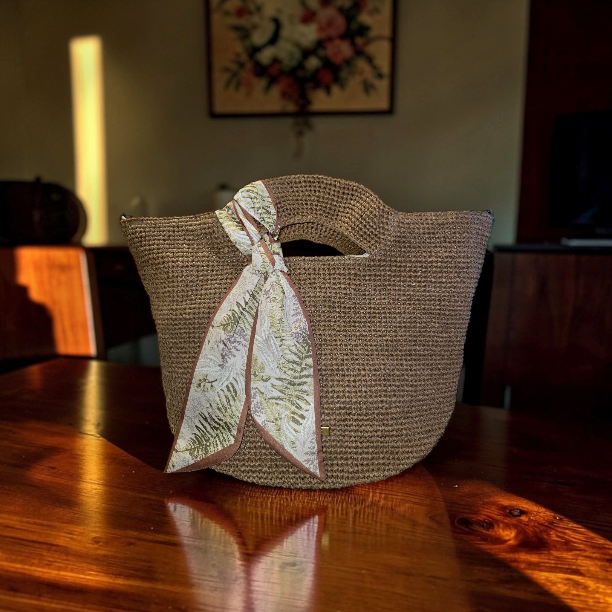 Bolso de rafia marron y pespuntes estratégicamente ubicados para llevarlo todo organizado.Hecho con Rafia fino y suave.