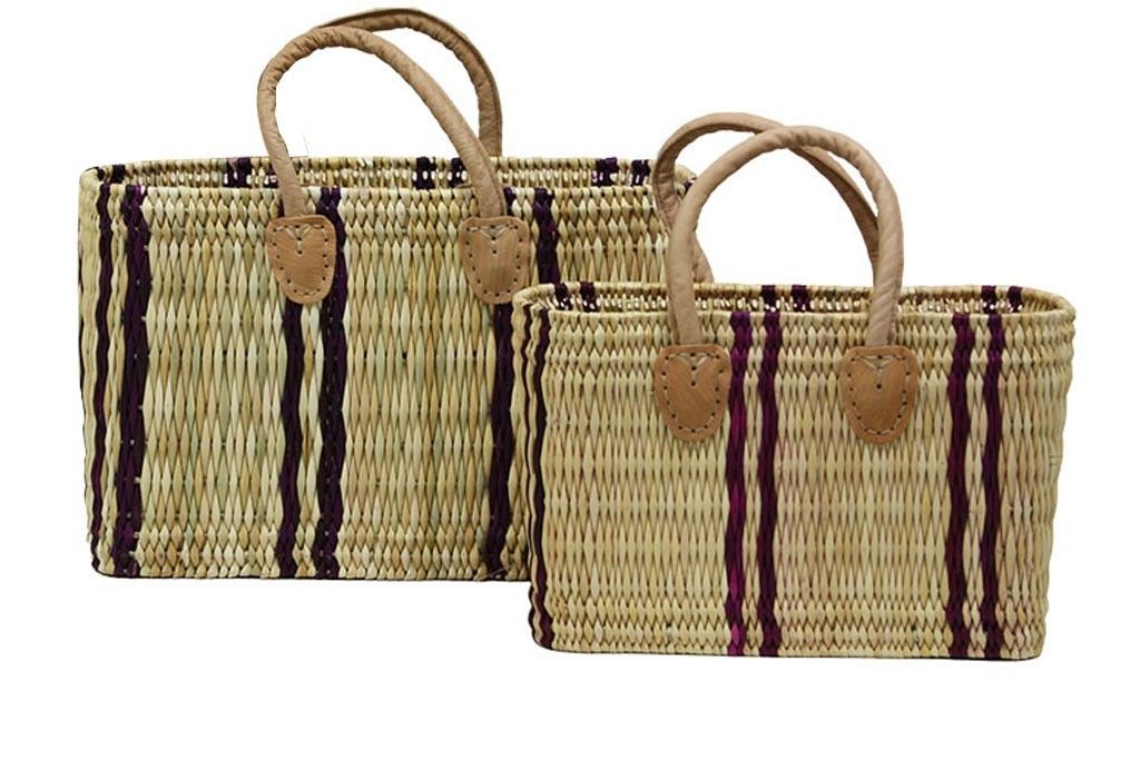 Capazos rústicos con asas de cuero de color natural y morado. El grande.