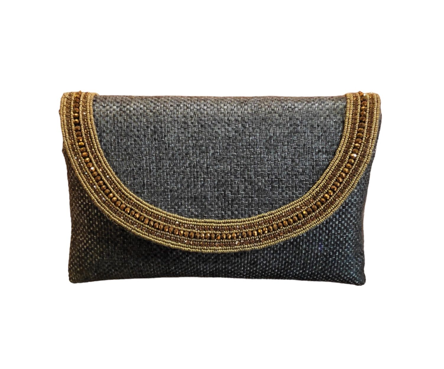 CARTERA ALHAMBRA, COLOR GRIS, DE YUTE Y SEDA, CON CADENA PARA COLGAR, MEDIDAS: 24 CM X15 CM X4,50 CM.