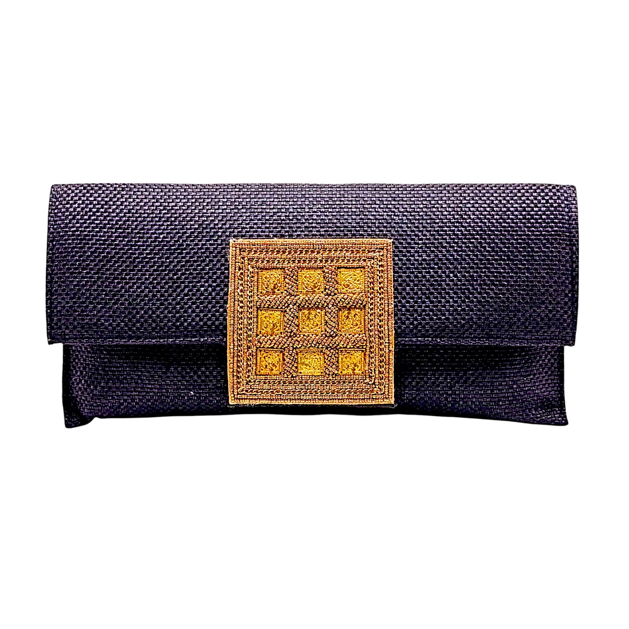 Cartera para eventos, elaborada en seda y yute con avalorio central. Con cadena para colgar.