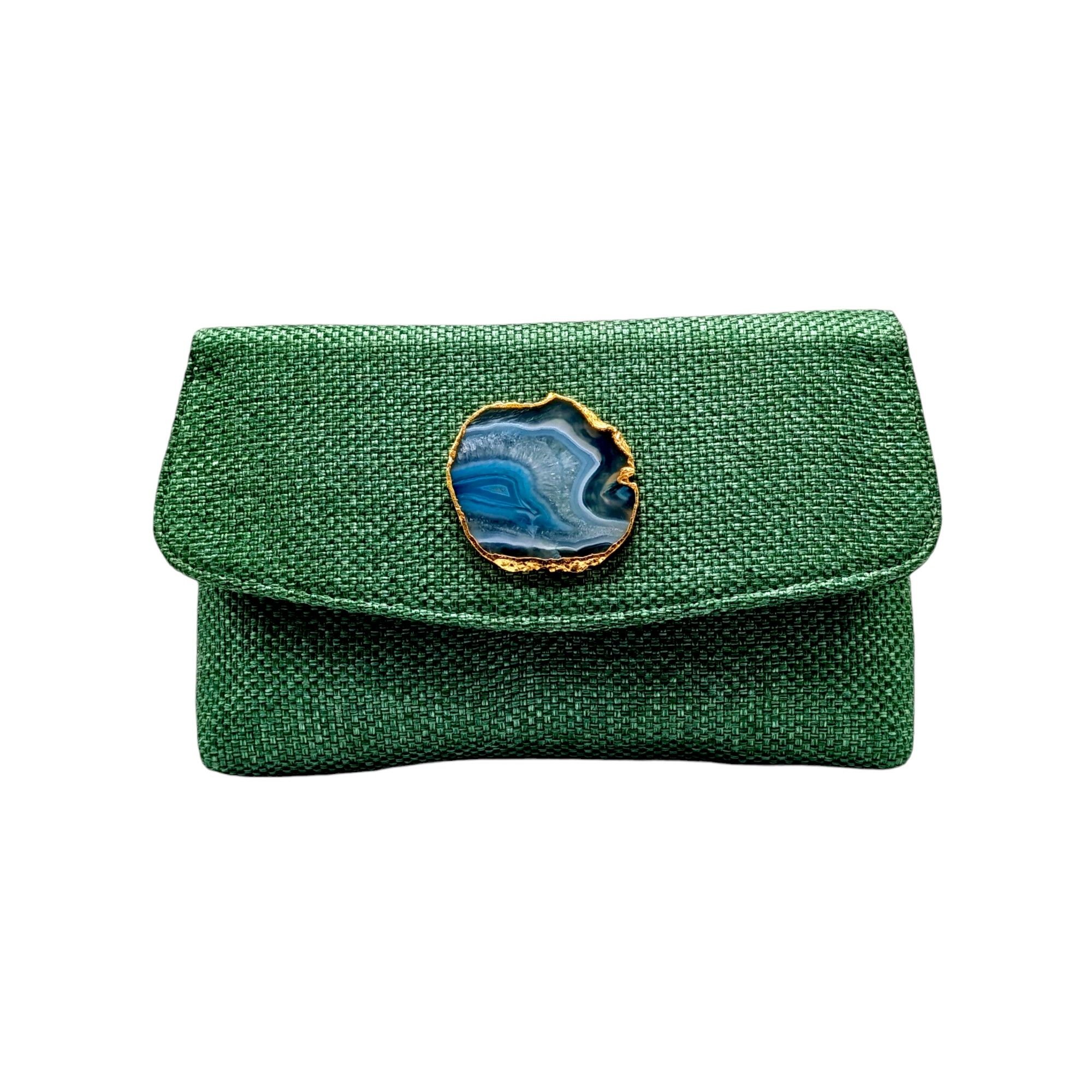 Cartera para eventos, elaborada en seda y yute con agata central, con cadena para colgar del hombro. Color verde.