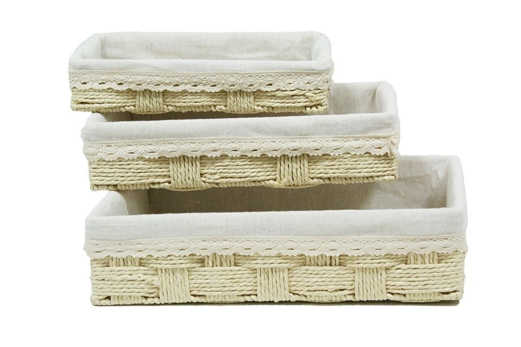 cajoneras de color beige decoradas con tela blanca con puntilla. Ideales para el almacenamiento y la decoración en el hogar.