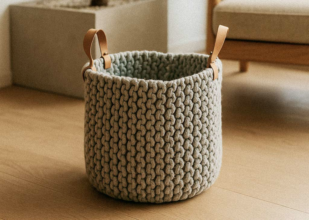 Cesto elaborado artesanalmente en algodon y con asas de cuero.