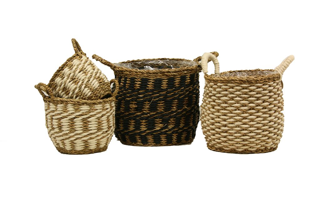 Macetero con asas de yute elaborado a mano, con forro de plastico.