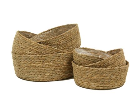 Cesto de seagrass con forro de plastico. Medidas: 24 x 24 x 10 cm de altura. Se puede utilizar como frutero o como macetero.