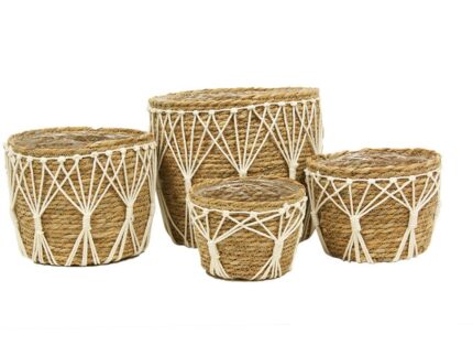 Macetero de seagrass con adornos de macrame, elaborado a mano. Con forro de plastico. Medidas: 23 x 23 x 17,5 cm. de altura.